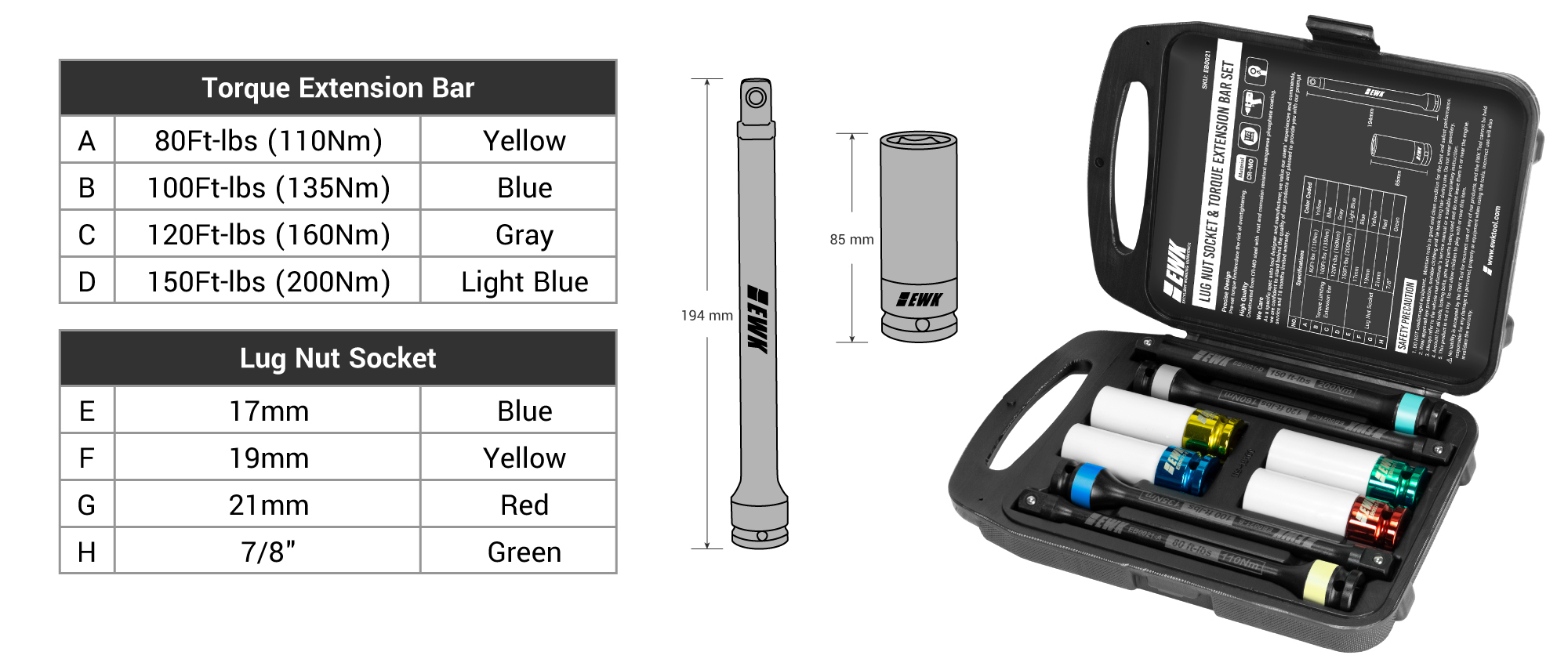 All in One ➤ EWK impact lug nut socket (17mm, 19mm, 21mm, 7/8 inch) and torque limiting extension bar set ( 80Ft-lbs, 100Ft-lbs, 120Ft-lbs, 150Ft-lbs ) is designed to remove and install the wheel lug nuts in the most safe and efficient way.