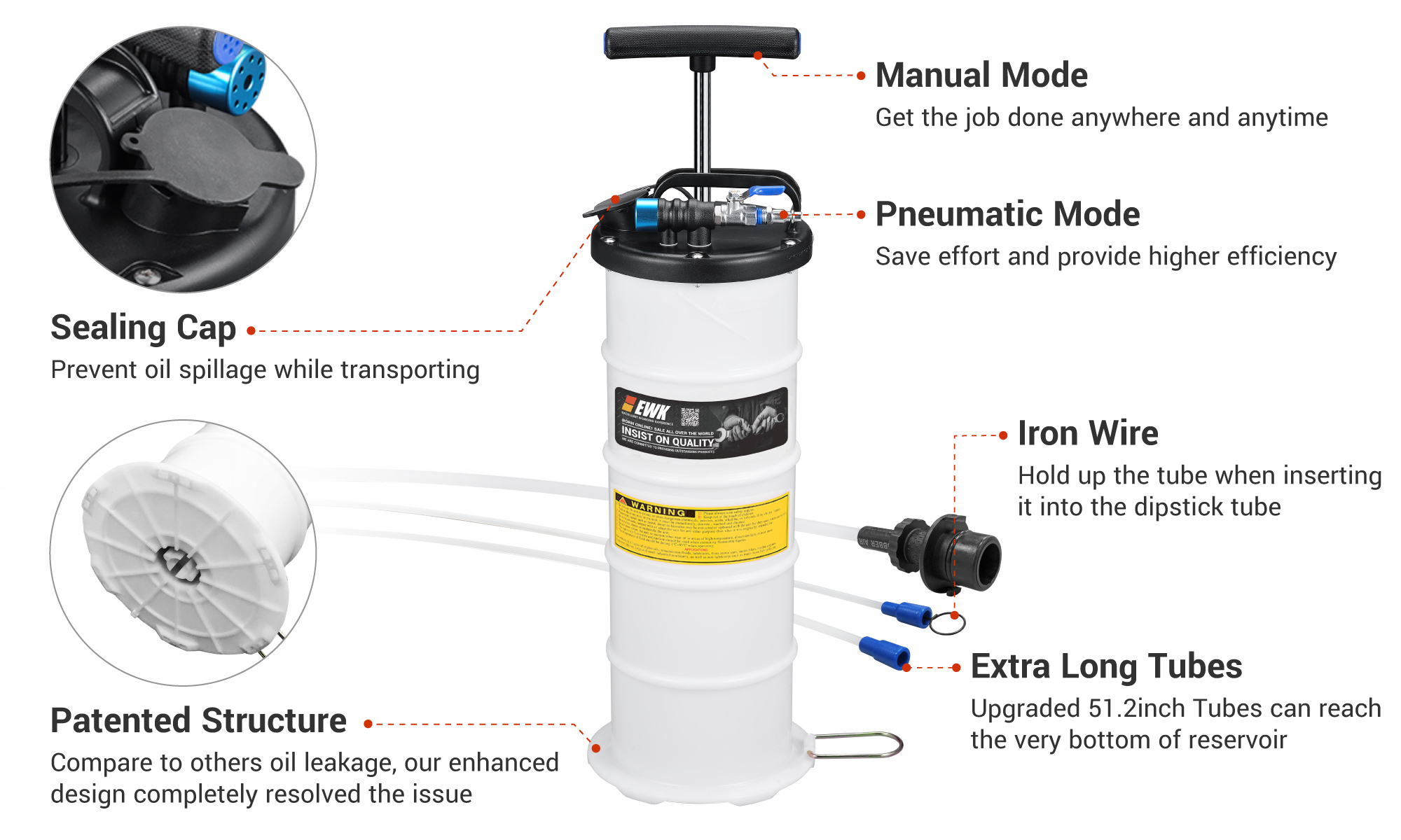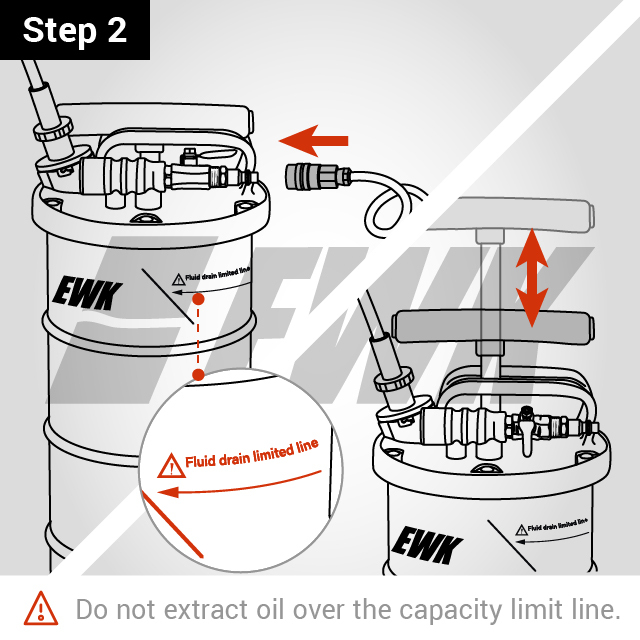 Choose your mode: For pneumatic mode, connect to an air compressor. For manual mode, pump the handle for 10 seconds (1 s/pump) to initiate auto extraction. After 30s, might need to pump again to maintain the vacuum and ensure the oil is fully drained.