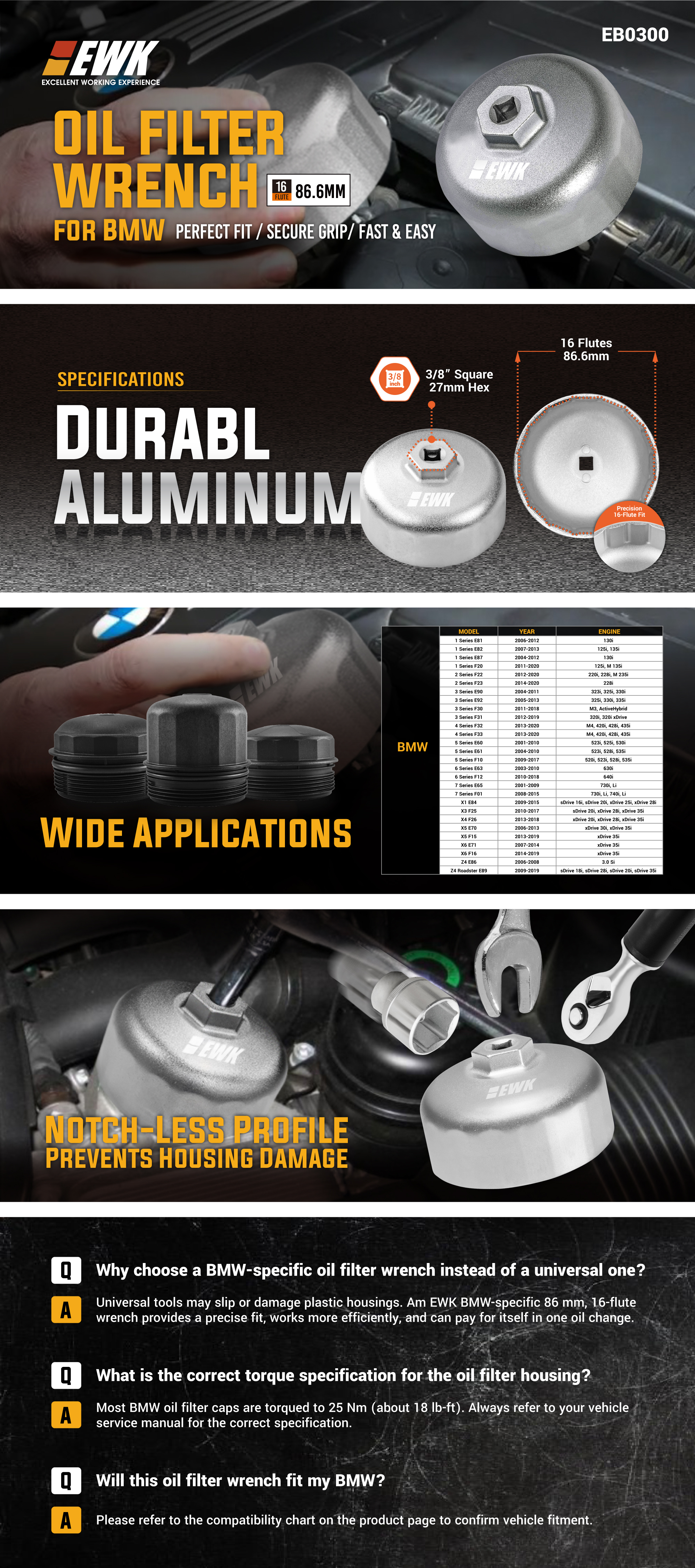 BMW Oil Filter Cap Removal ▶Designed for damage-free oil filter cap removal on BMW engines using 86mm 16-flute cartridge-style filter housings, including N20, N26, N51, N52, N54, N55, N63, N74, S55, and S63 engines.