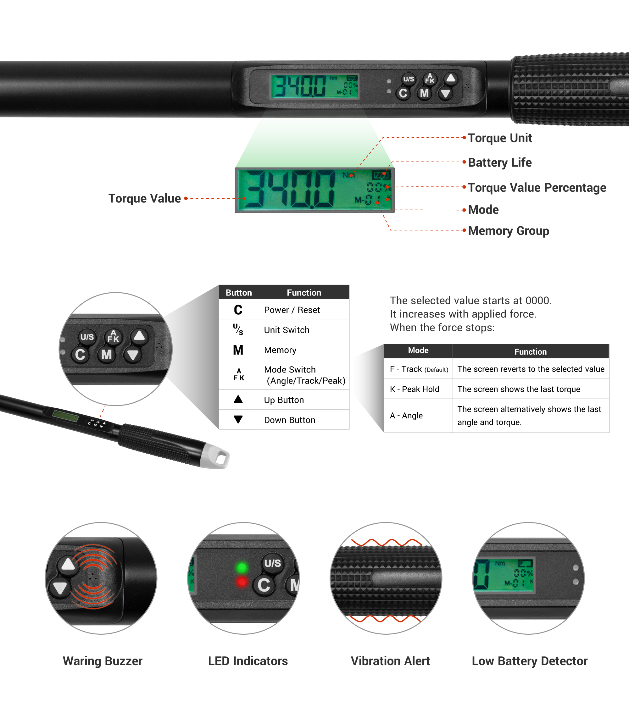 Press the C button to turn on the wrench, all text on the LCD will flash. After displaying 0000, the wrench is ready for operation.