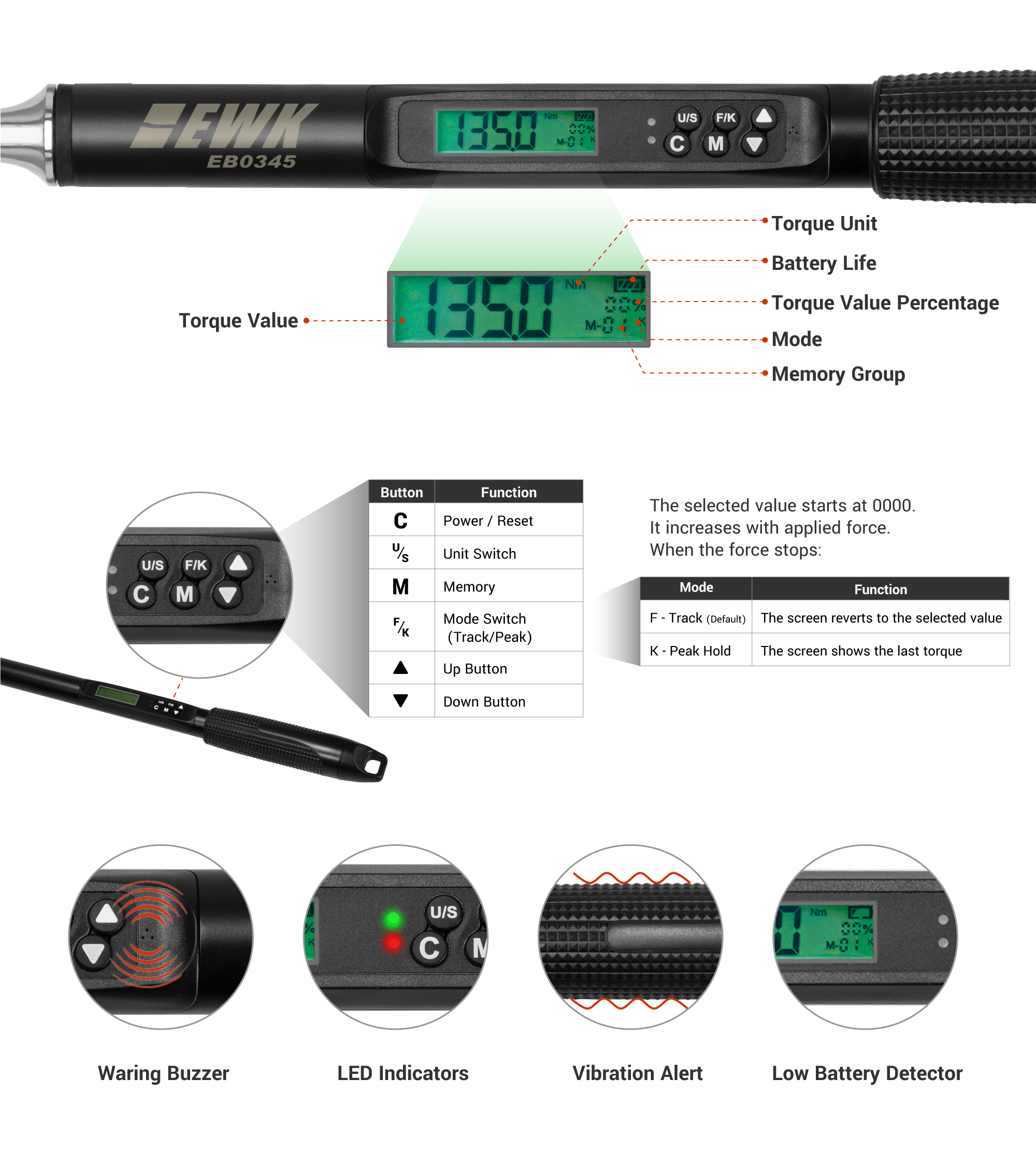 Press the C button to turn on the wrench, all text on the LCD will flash. After displaying 0000, the wrench is ready for operation.