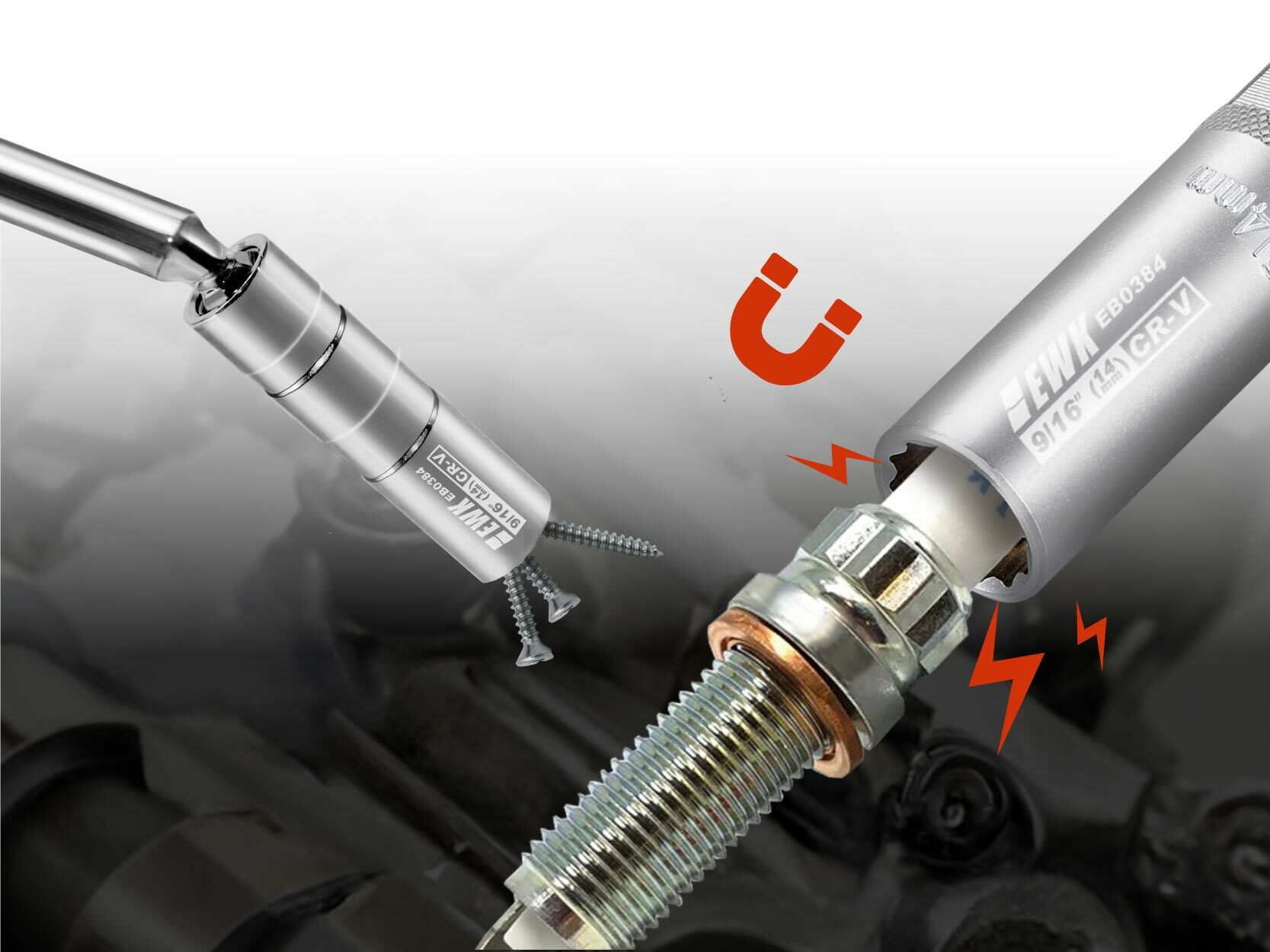 Magnetic spark plug socket retains spark plug stay firmly for easier installation and removal.
