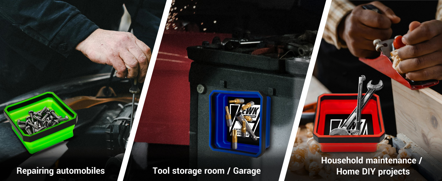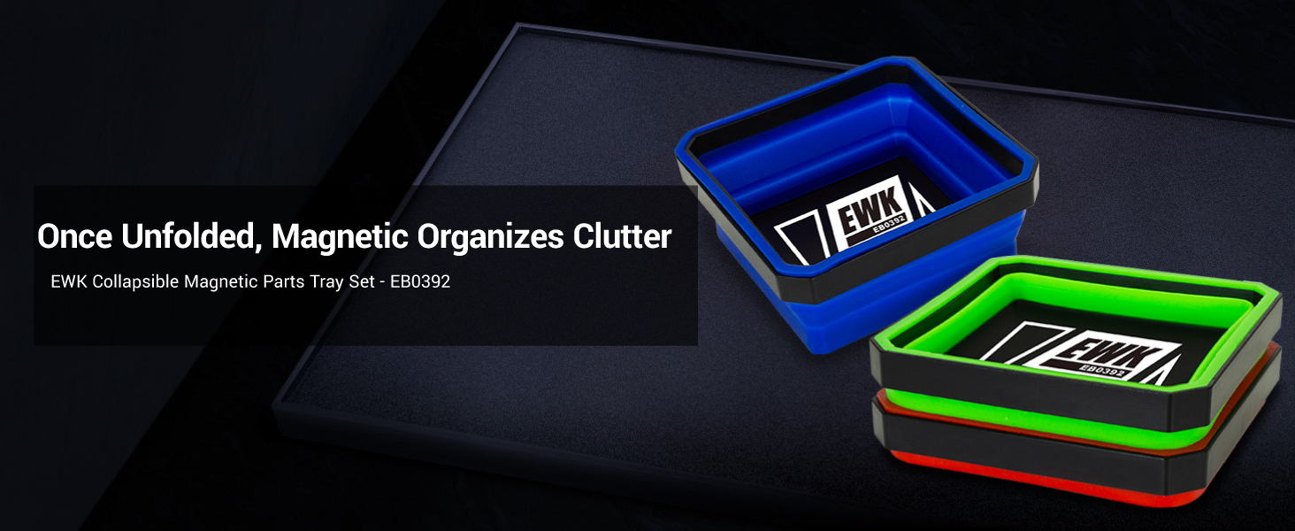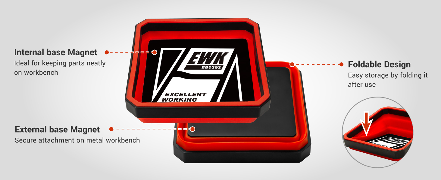EWK's Magnetic Parts Tray securely holds small components in place for mechanic tool sets and work benches with a strong internal magnet.
