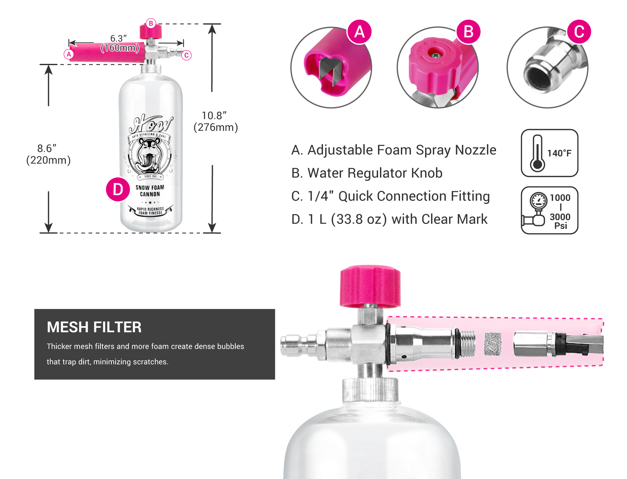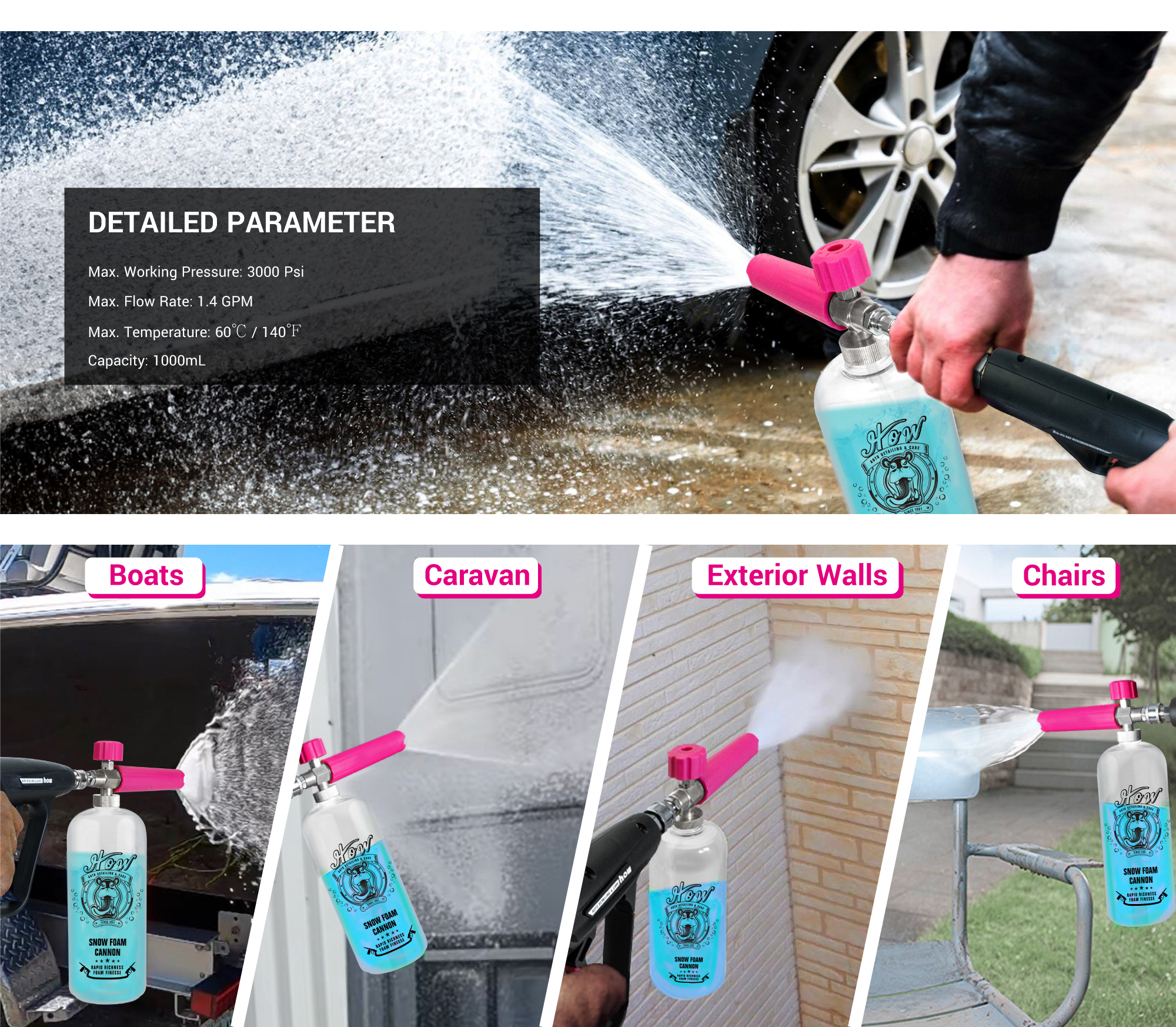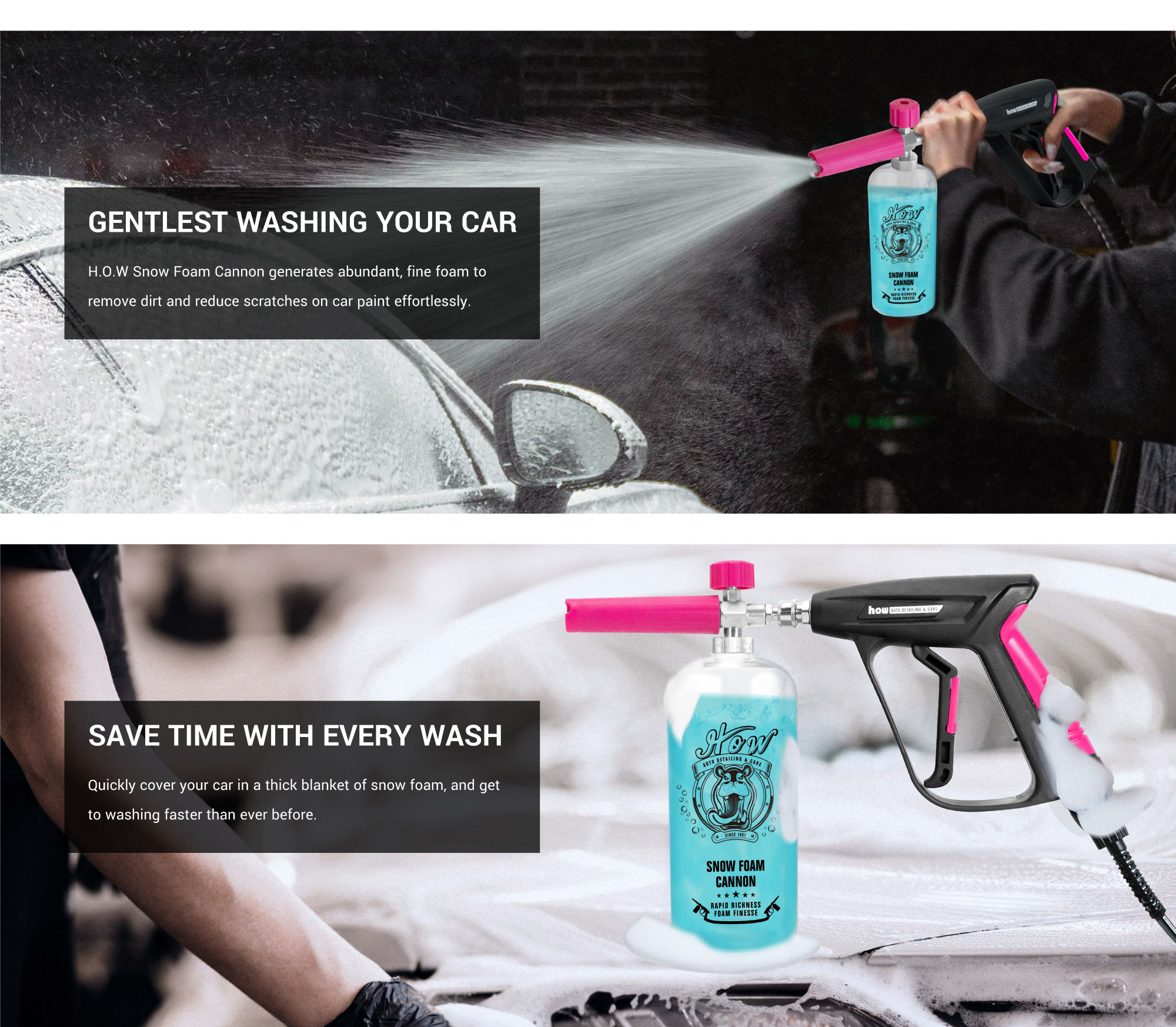 Wet the car body. Then add car wash soap (100-200 c.c) and water to the foam cannon and shake it well.